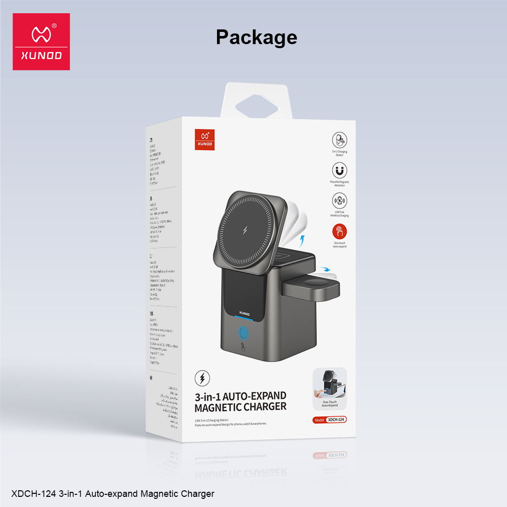 自动搜索,一触展开,无线快充,强磁吸附,三合一设计,适配更多设备充电。